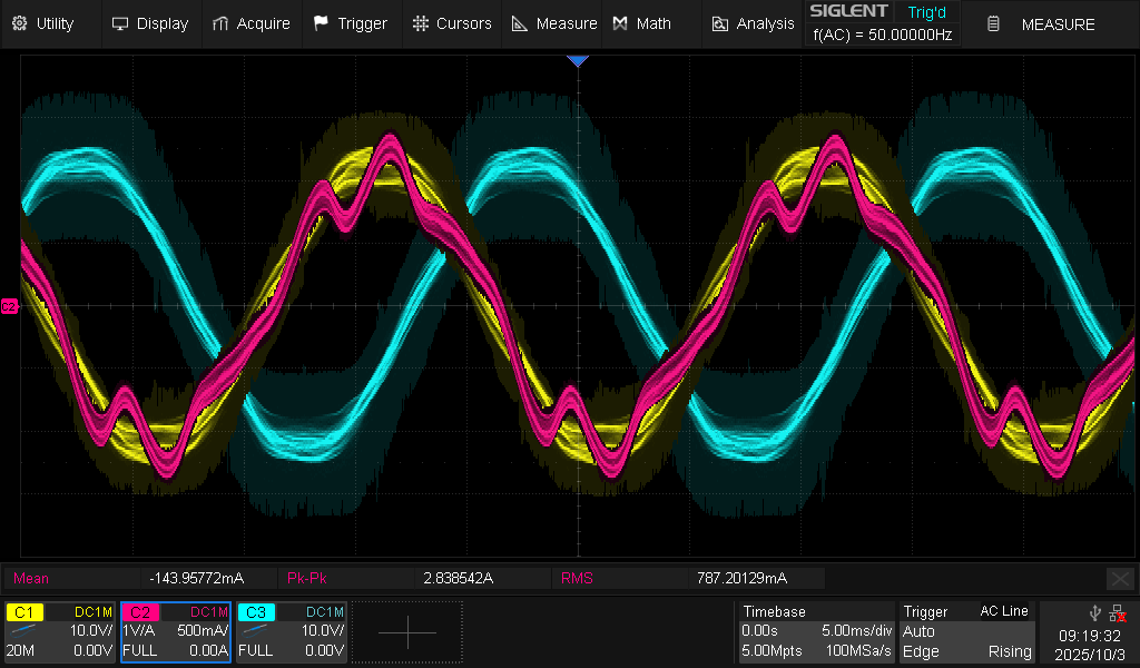 Scope capture (1A setpoint. Yellow: Ph1 grid voltage, Pink: Ph1 Current, Cyan: Ph2 grid voltage)