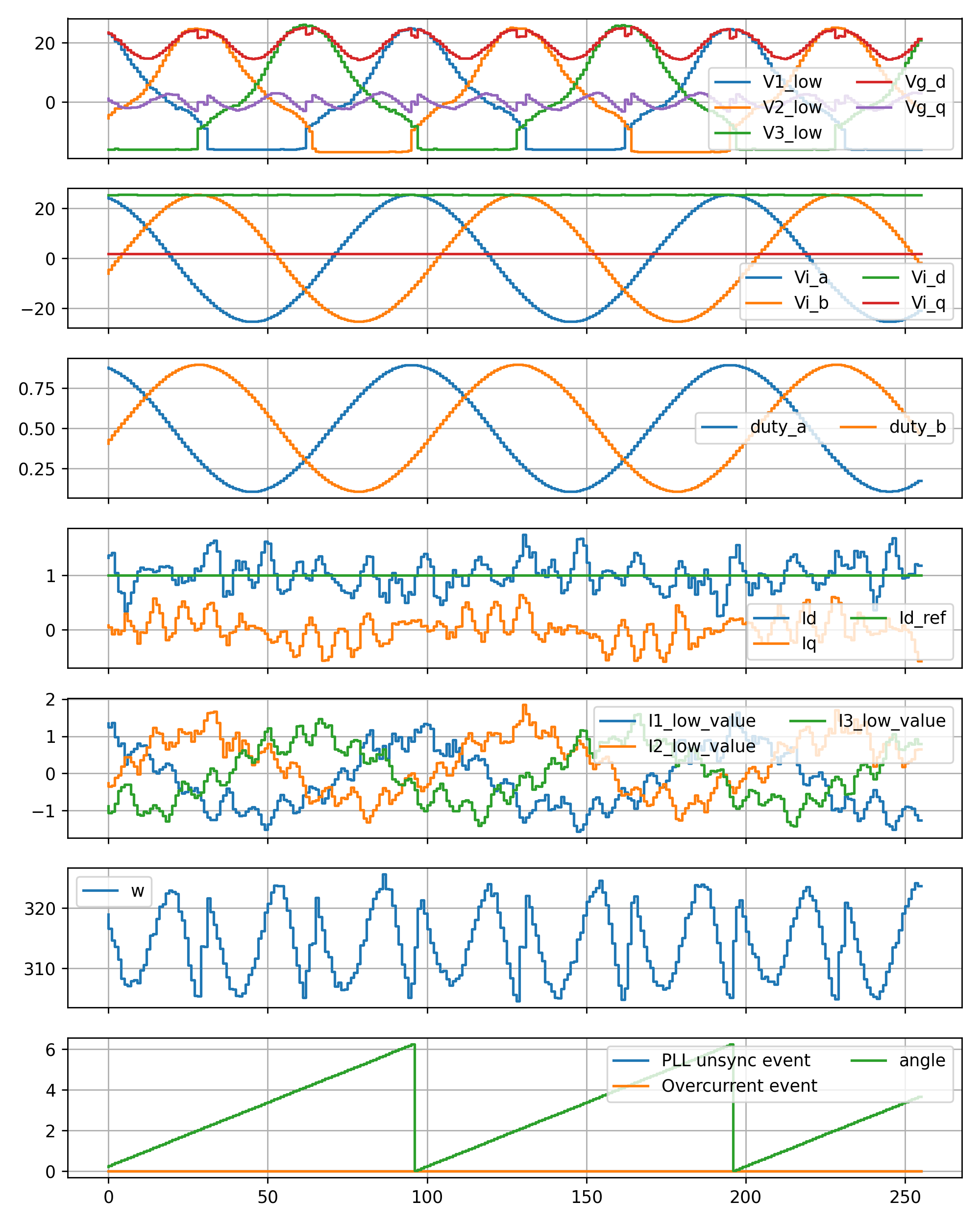 The converter follows the Id/q current setpoint with the expected transient convergence (closed loop time constant set to 5ms or 20ms).
