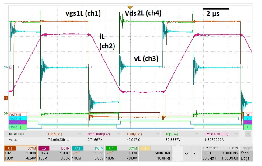 Figure 7 - Main operating signals over one switching period (phase-shift mode). Parameters: 60 V bus voltage, 80 kHz switching frequency, 50 µH inductance, 150° phase shift, 300 ns dead time.