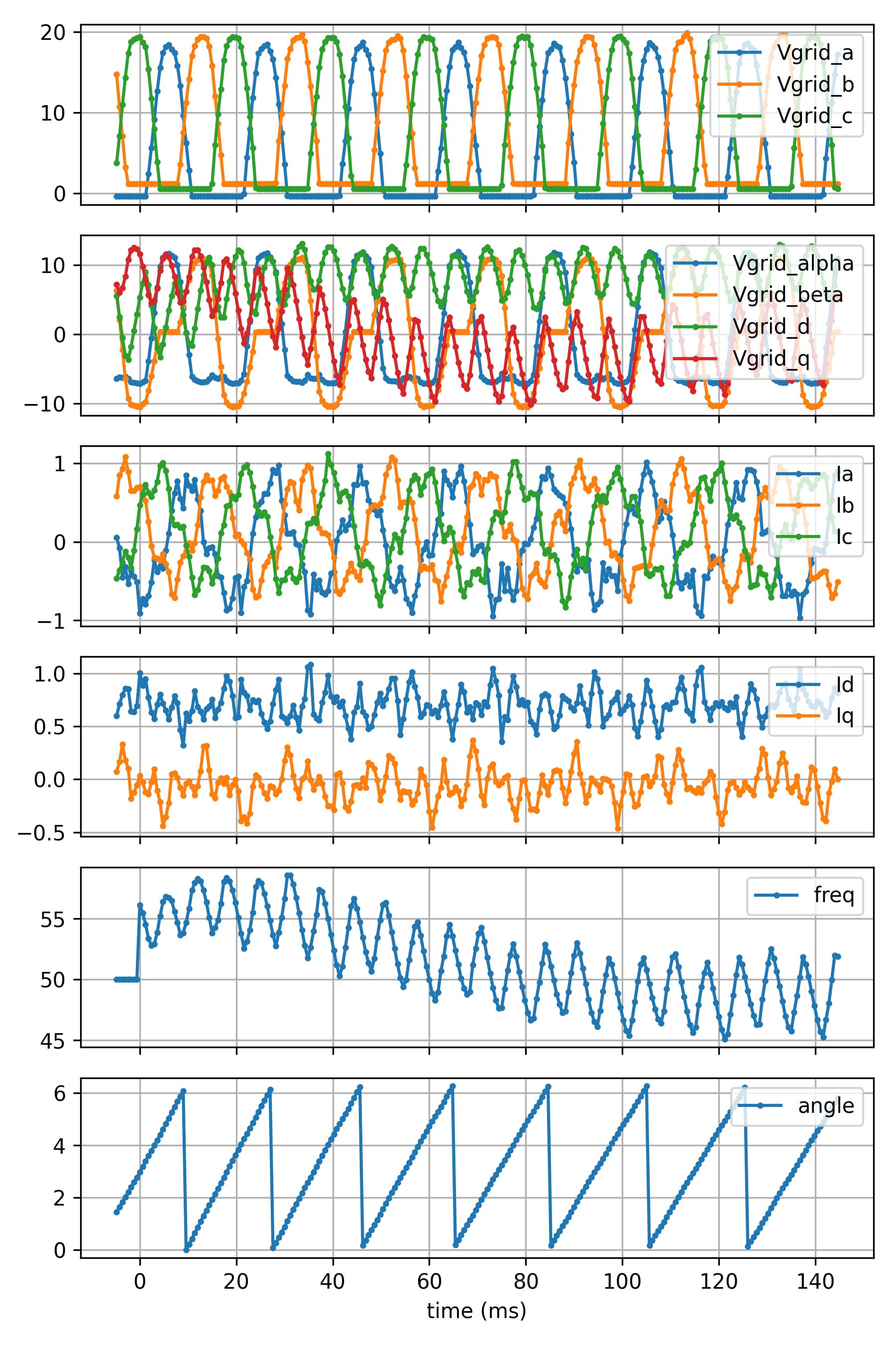Starting with the Inverter+PLL, using the embedded scope is needed. I’ve modified the original ScopeMimicry to fix some bugs and improve some aspects. In particular, a time vector is recorded.